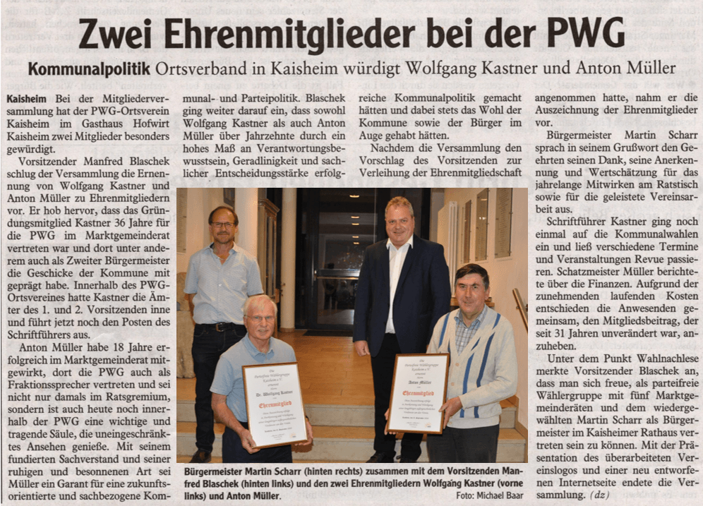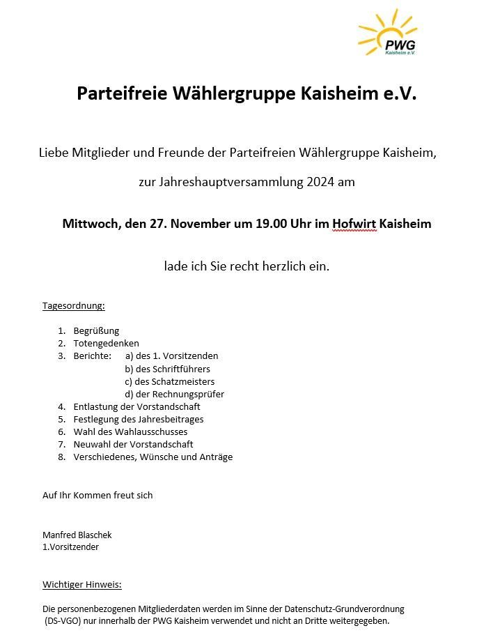 Liebe Mitglieder und Freunde der Parteifreien Wählergruppe Kaisheim,